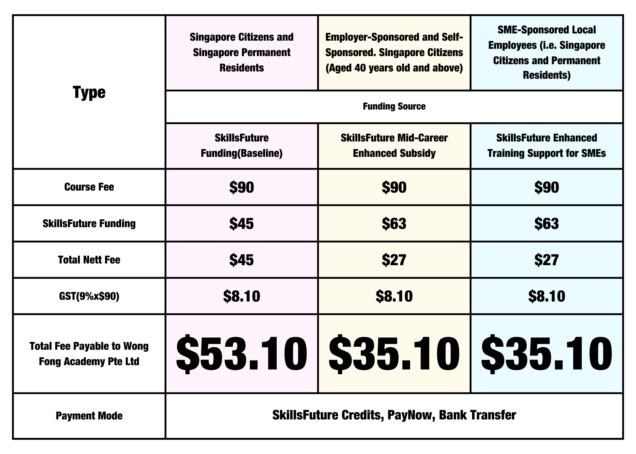 *From 1 Jan 2022, SkillsFuture course funding will be revised to a baseline of 50% subsidy, with an additional 20% subsidy (up to 70% subsidy) for SMEs and Mid-career individuals (Singapore citizens above 40 years old) . Do note that the funding amount advised is not final and is subject to changes.