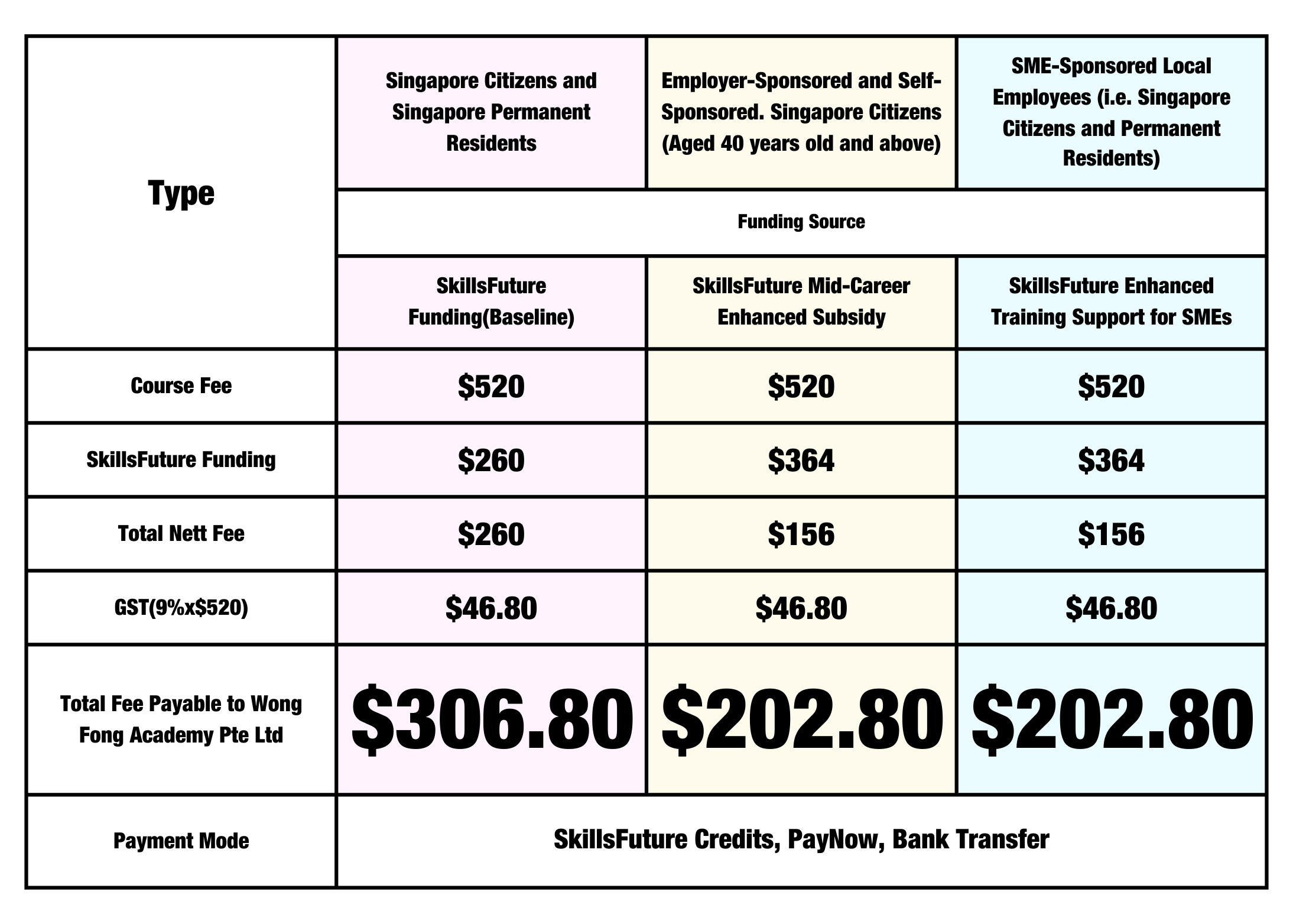*From 1 Jan 2022, SkillsFuture course funding will be revised to a baseline of 50% subsidy, with an additional 20% subsidy (up to 70% subsidy) for SMEs and Mid-career individuals (Singapore citizens above 40 years old) . Do note that the funding amount advised is not final and is subject to changes.