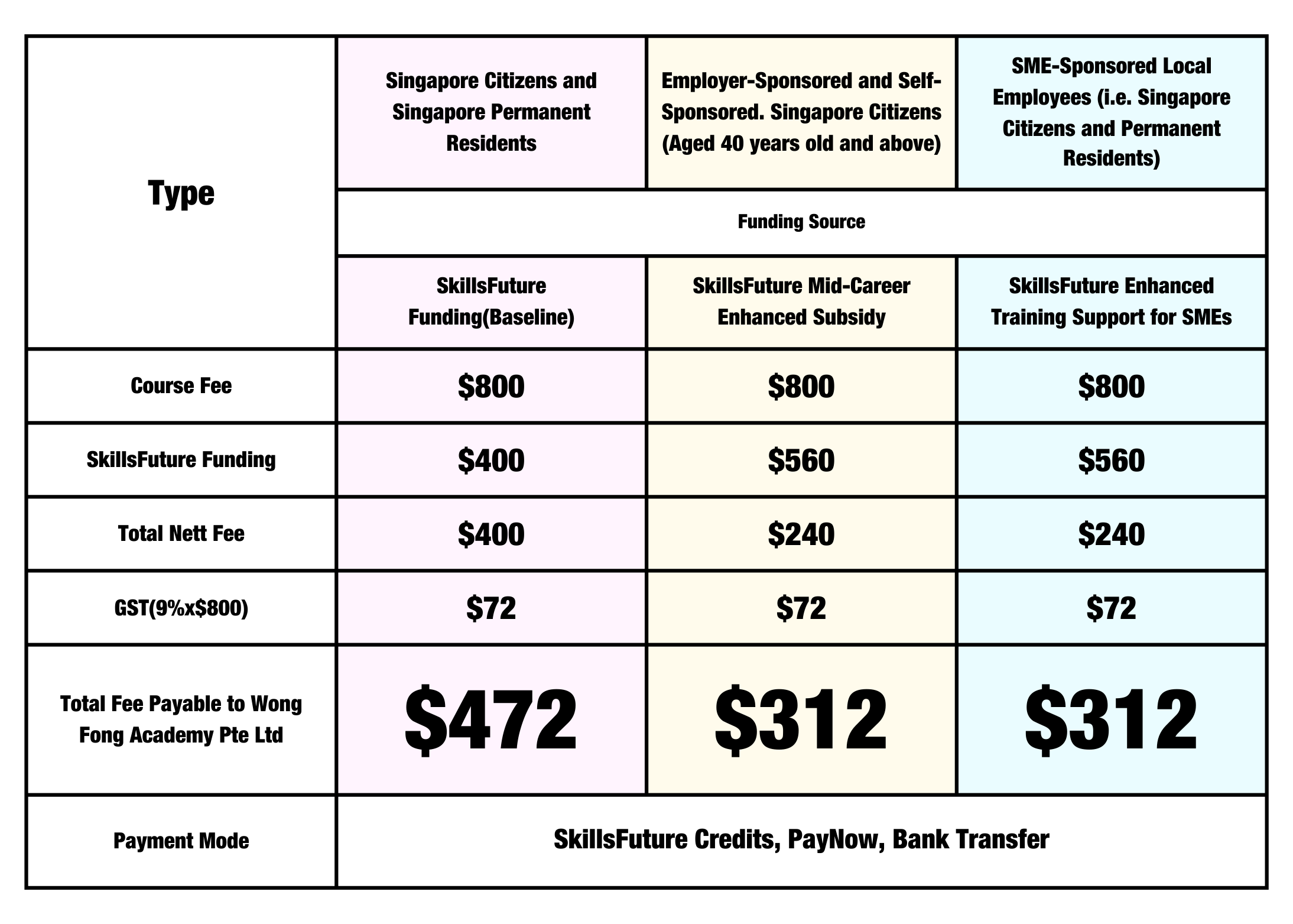 *From 1 Jan 2022, SkillsFuture course funding will be revised to a baseline of 50% subsidy, with an additional 20% subsidy (up to 70% subsidy) for SMEs and Mid-career individuals (Singapore citizens above 40 years old) . Do note that the funding amount advised is not final and is subject to changes.